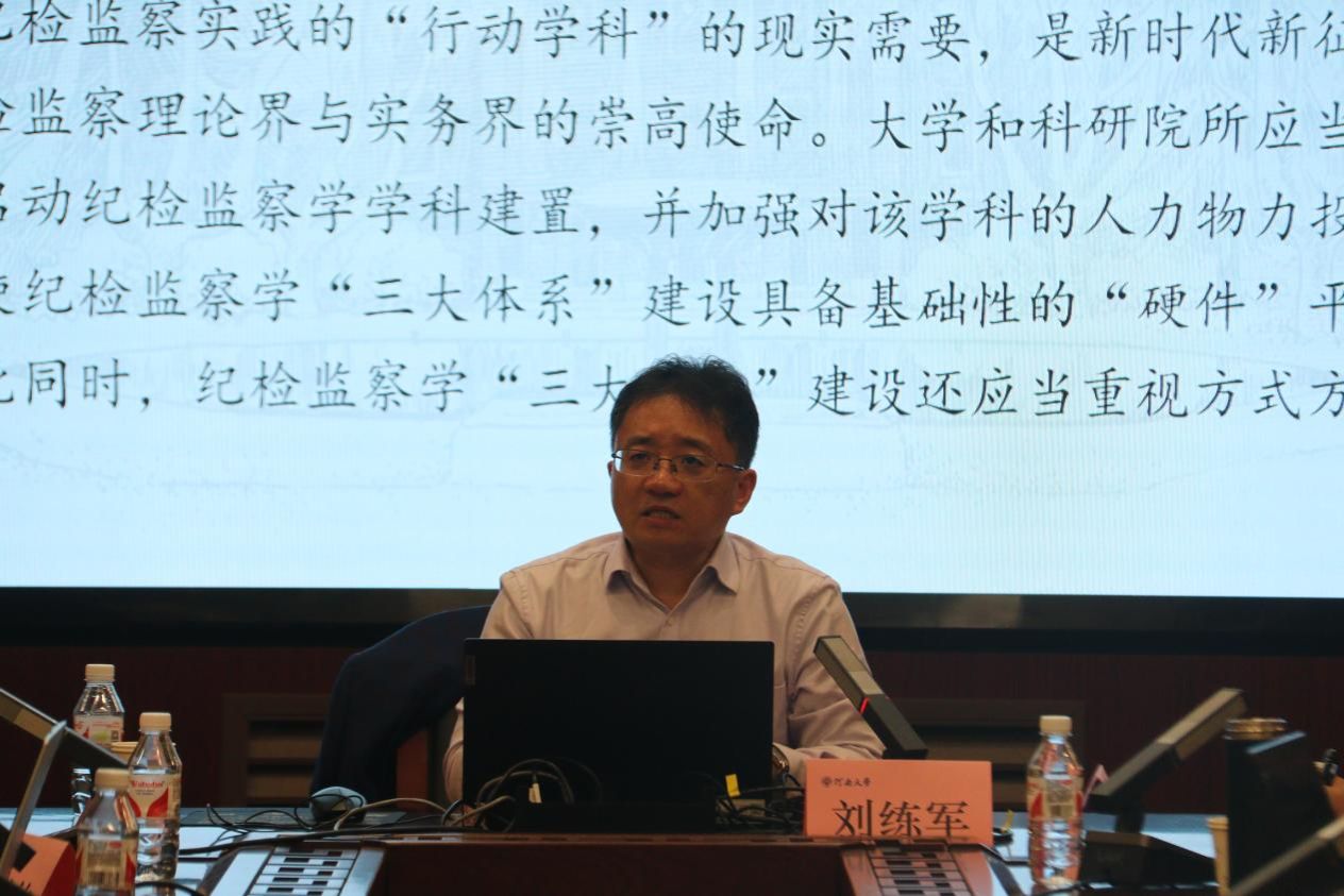 讲座伊始,刘练军教授阐述了纪检监察学的学科地位和发展现状,纪检监察学是国家纪检监察体制改革深化的产物,是新时代形成的新兴哲学社会科学。随后,刘教授详细解读了纪检监察学的学科体系、学术体系和话语体系的构建方案,包括理论学科、解释学科、实务学科与历史学科的划分,以及学术体系的复合构造和话语体系的基本类型。刘教授倡导,纪检监察学的“三大体系”建设应立足于中国的纪检监察实践,坚持问题导向,应提出具有主体性和原创性的理论观点,形成彰显中国特色、中国风格、中国气派的纪检监察学“三大体系”。